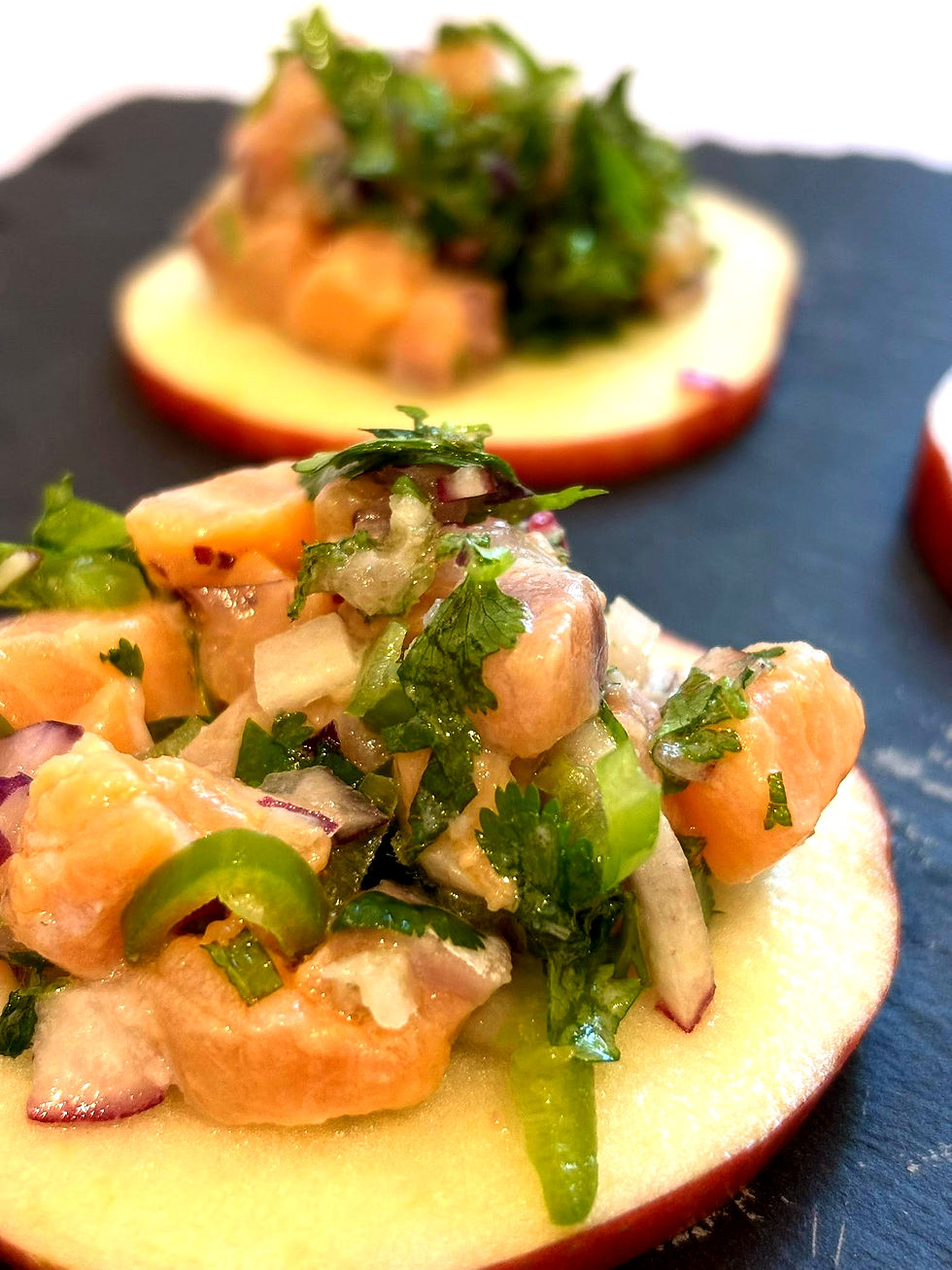 סביצ'ה סלמון על מצע פרוסת תפוח עץ מזן "גיגה"